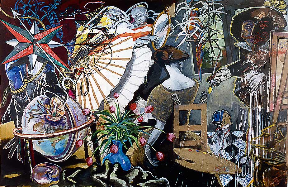 Hoe brengt men binnen luttele vierkante meters gevarieerde cultuurperiodes in beeld als de rococo, de gouden eeuw, of de crisis in de jaren twintig? Het schilderend tweespan heeft het antwoord gevonden; met veel verf en met veel fantasie. Behalve over fantasie beschikken zij echter ook over goede smaak. Zie hun impressie van het tijdperk der inquisitie. Voor de hand had gelegen een centraal staand symbool als de brandstapel te nemen. Zij kozen echter voor een gestileerd kruis, waarvan het kardinaalspaars afdruipt.